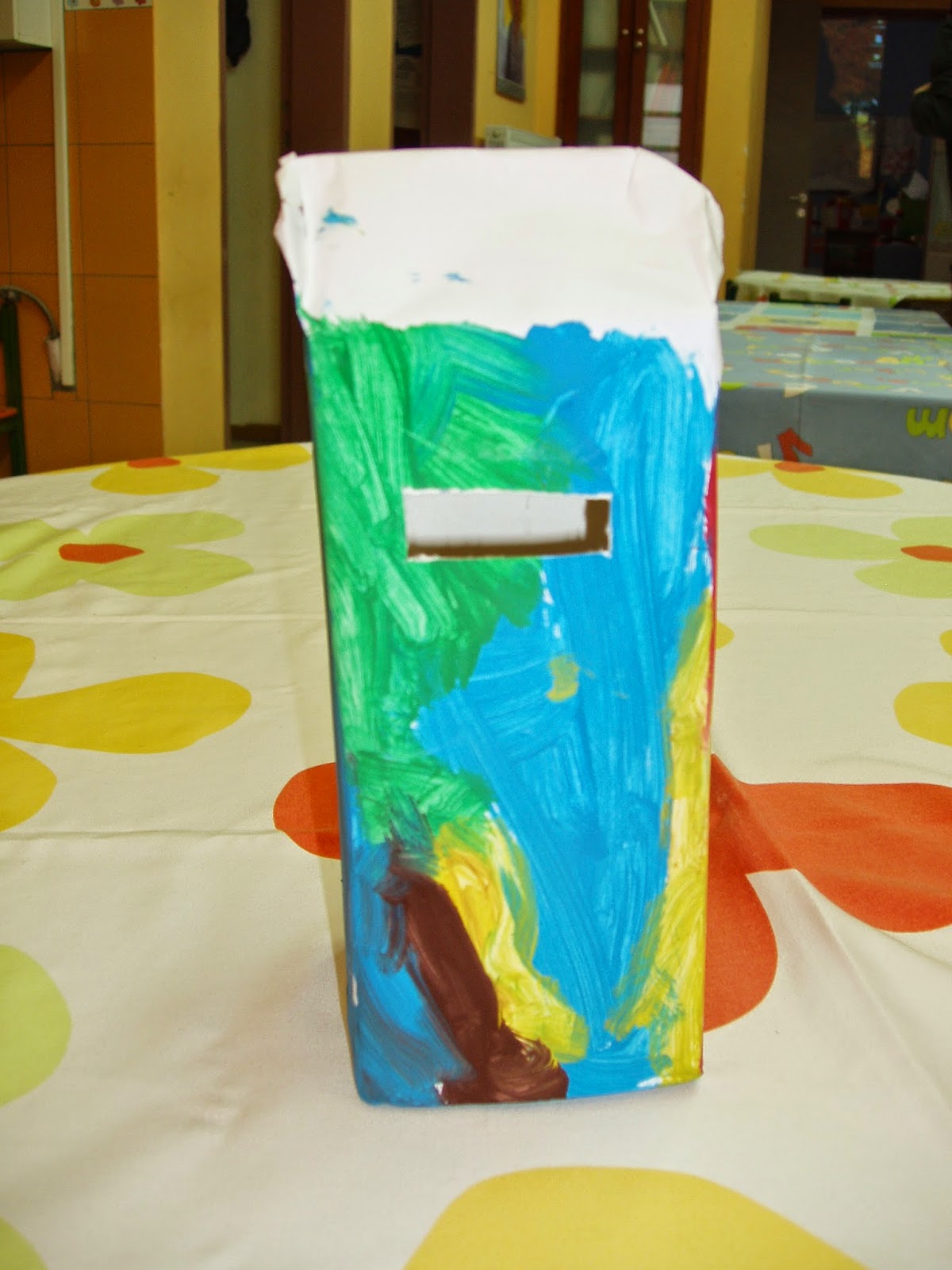 Κατασκευάσαμε κουμπαράδες με άχρηστο υλικό (κουτιά από γάλα), τα οποία τα τυλίξαμε με άσπρο χαρτί και τα ζωγραφίσαμε με τέμπερες.