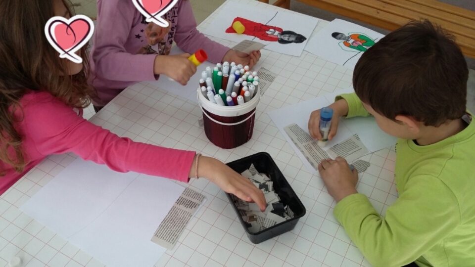 Στη συνέχεια κάναμε συγκρίναμε την Guernica με τον άλλον πίνακα του Picasso "το κορίτσι και το περιστέρι", βρήκαμε τους συμβολισμούς και τα μηνύματα και παίρνοντας στοιχεία του αρχικού πίνακα, φτιάξαμε τον δικό μας με τίτλο "το παιδί και το περιστέρι". Τα παιδιά κλήθηκαν να συμπληρώσουν τον πίνακα βάζοντας στη θέση του κοριτσιού τον εαυτό τους να κρατά το περιστέρι της ειρήνης. Στη συνέχεια αφού κάλυψαν το μισό χαρτί με κομματάκια από εφημερίδες και το υπόλοιπο το χρωμάτισαν με νερομπογιές, κόλλησαν τη φιγούρα τους. Το αποτέλεσμα τους ενθουσίασε!